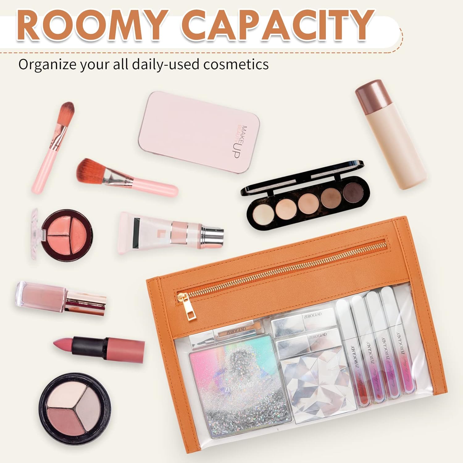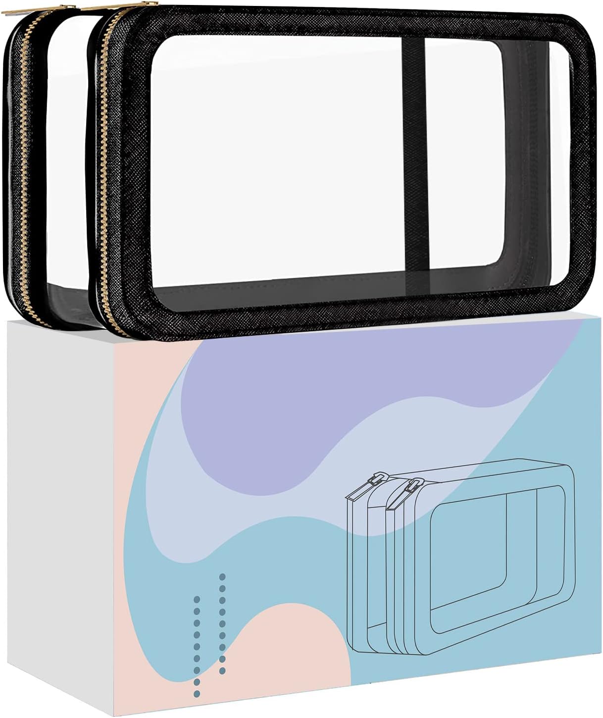 SUEBONI's TSA-approved clear leather makeup bag - waterproof, stylish, and perfect for organizing travel cosmetics and accessories for women.
