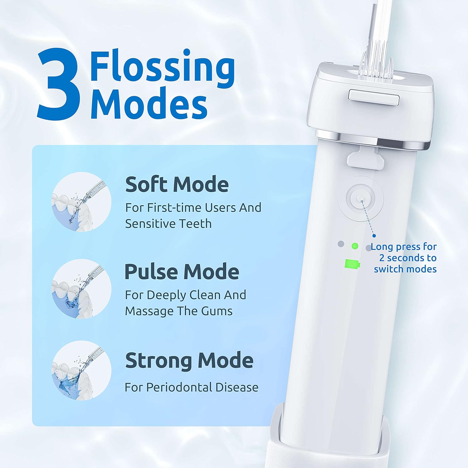 SYNHOPE Portable Water Flosser: Compact with telescopic tank, 3 modes, 140PSI, IPX7 waterproof, 30-day battery, ideal for travel and daily use.