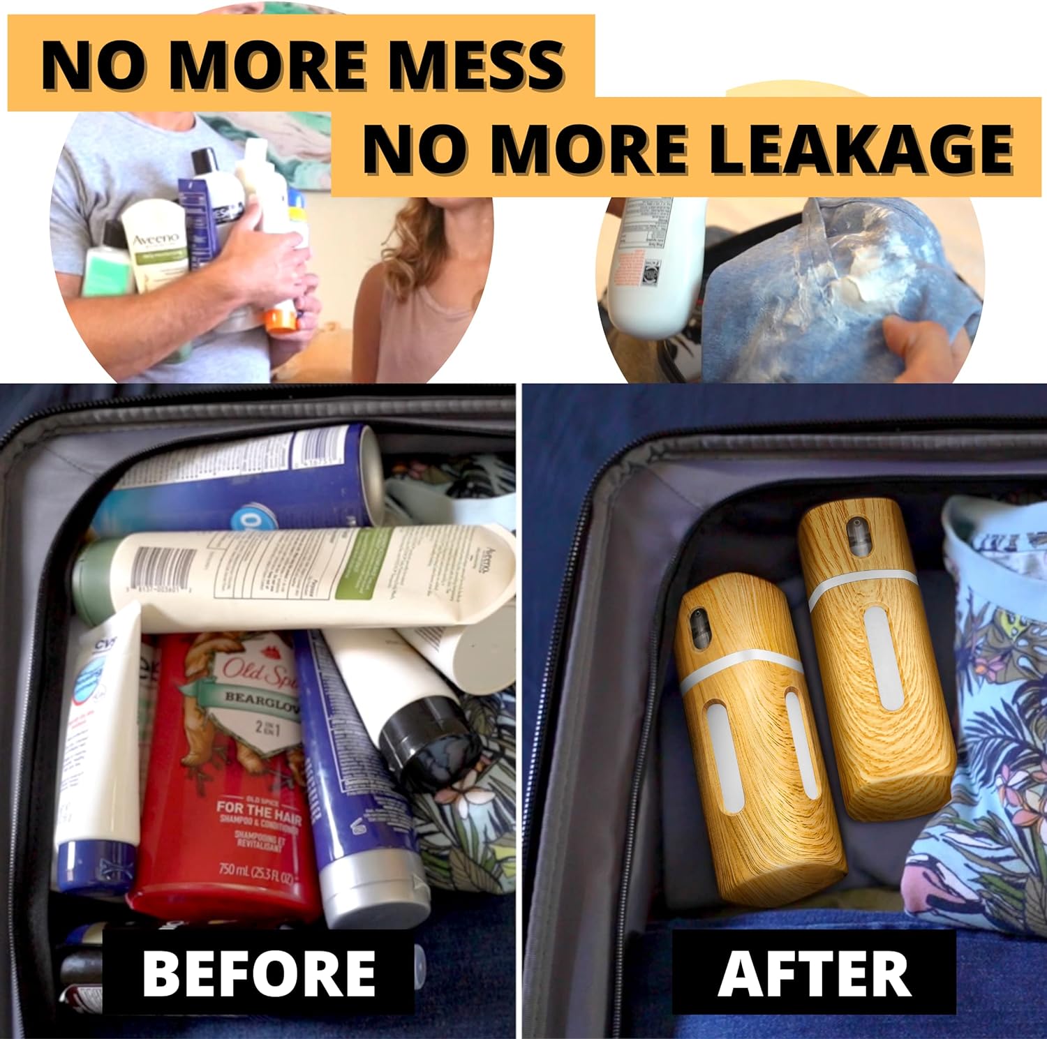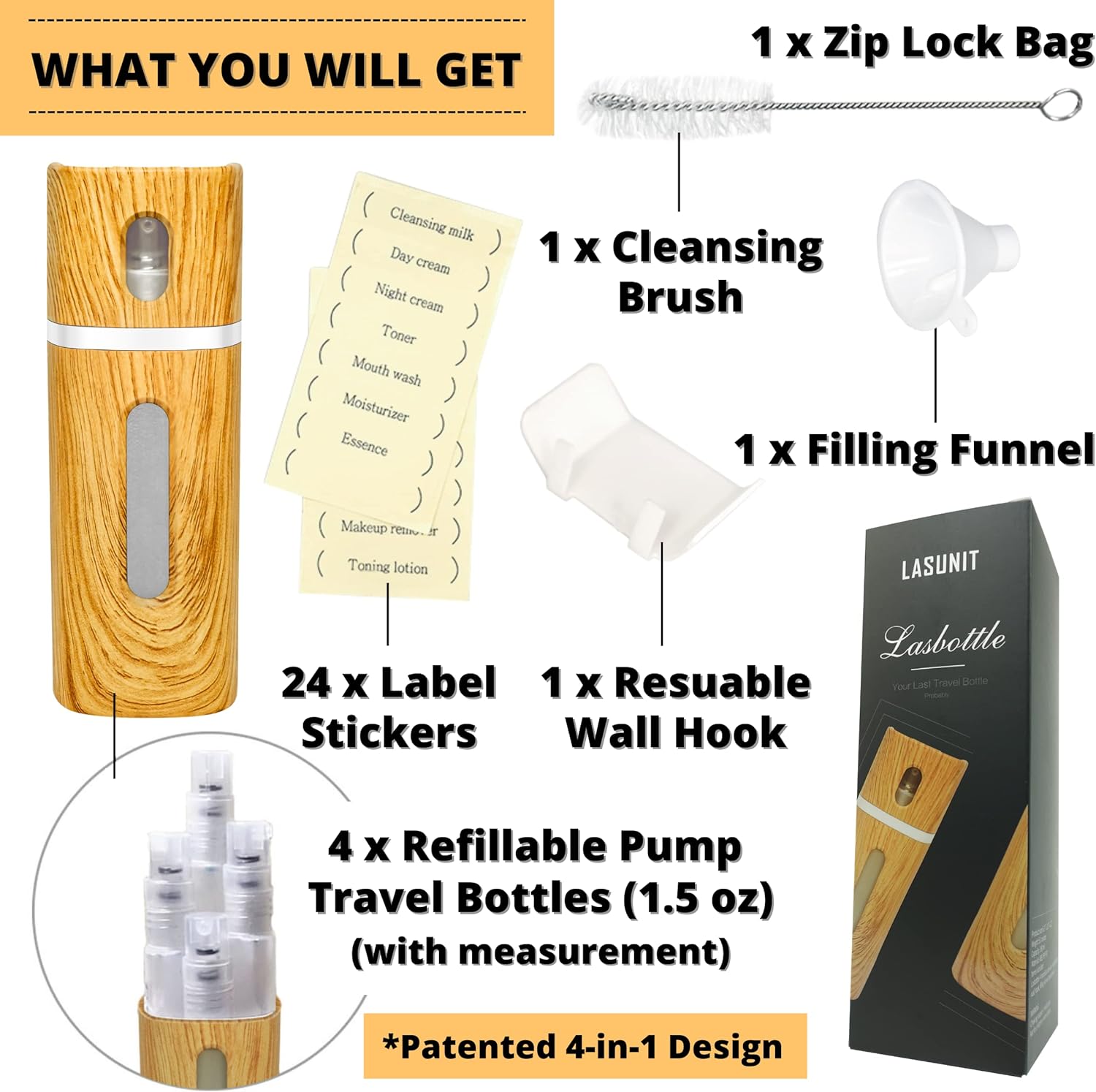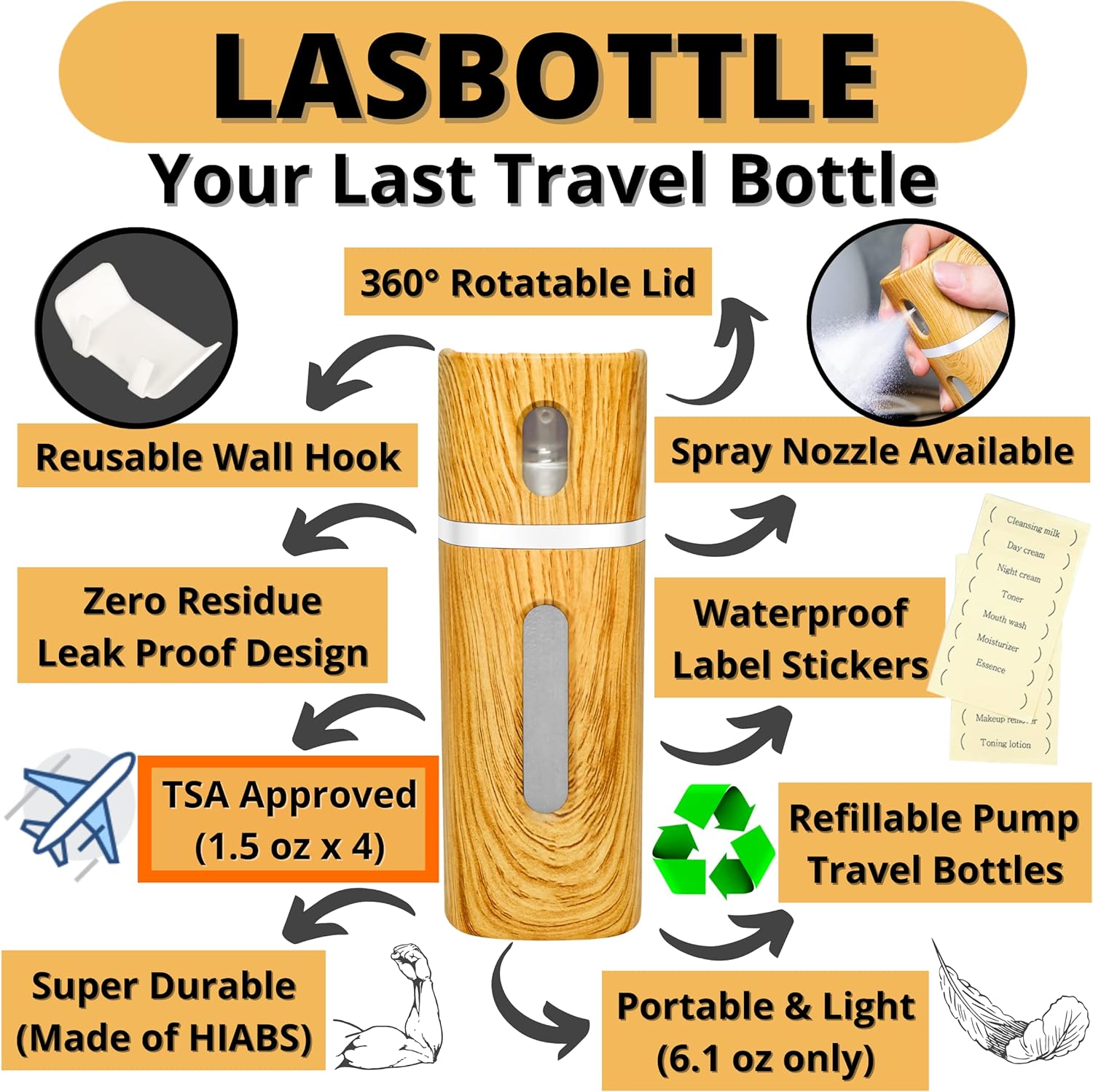 Effortlessly carry liquids with Lasbottle's 4-in-1 travel bottle set. Leak-proof, eco-friendly, and perfect for thick solutions. Includes spray nozzle!